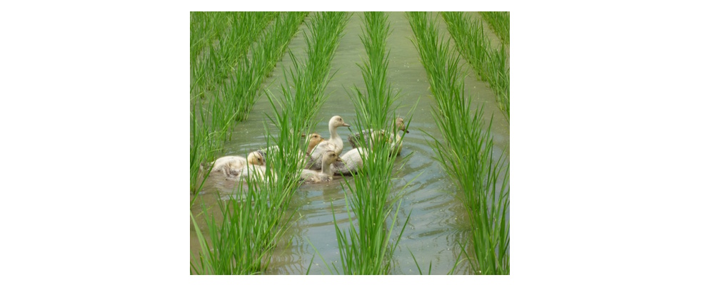 合鴨農法とは、合鴨のヒナを田んぼに放ち、害虫や雑草を食べてもらい、合鴨の糞を主の肥料としてお米づくりを行う農法です。